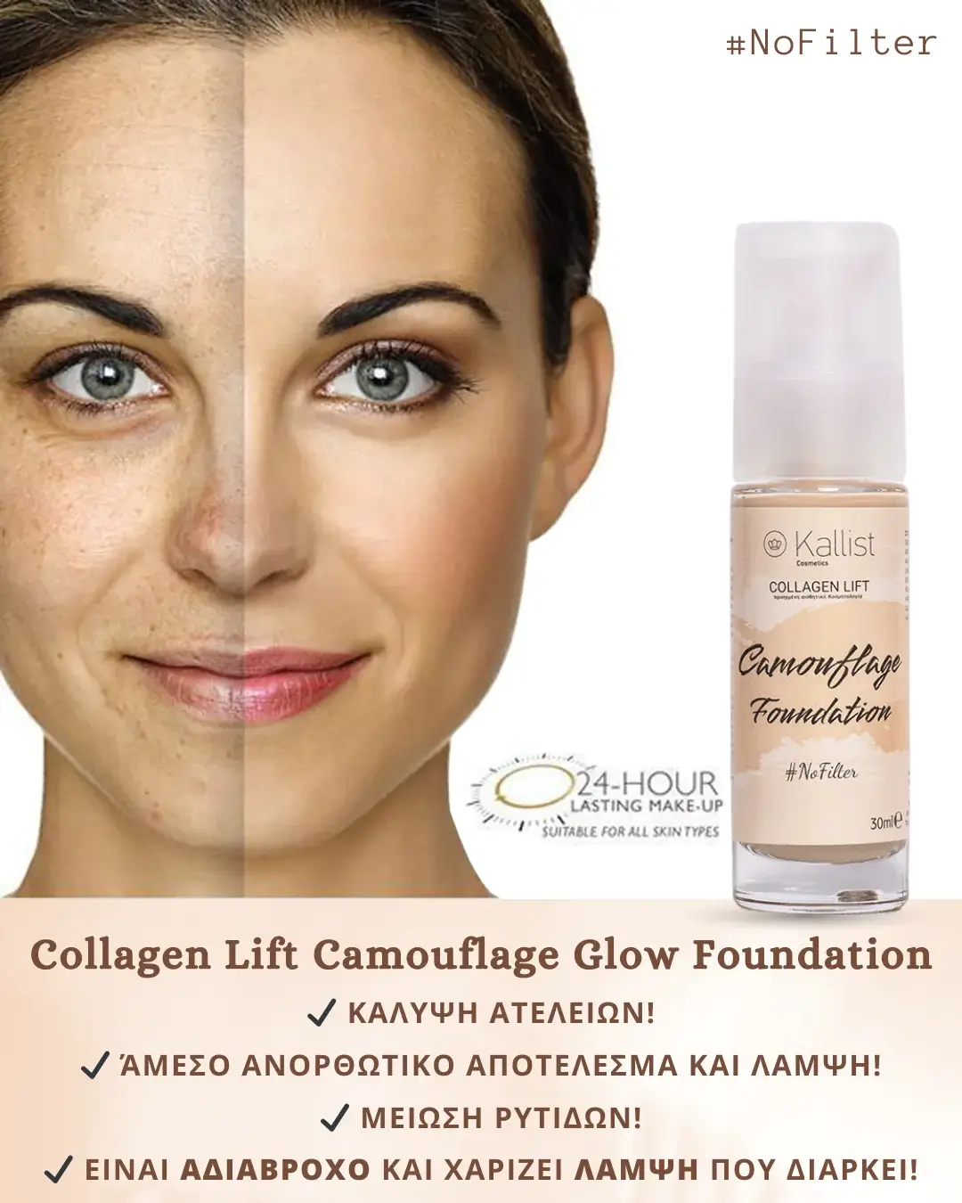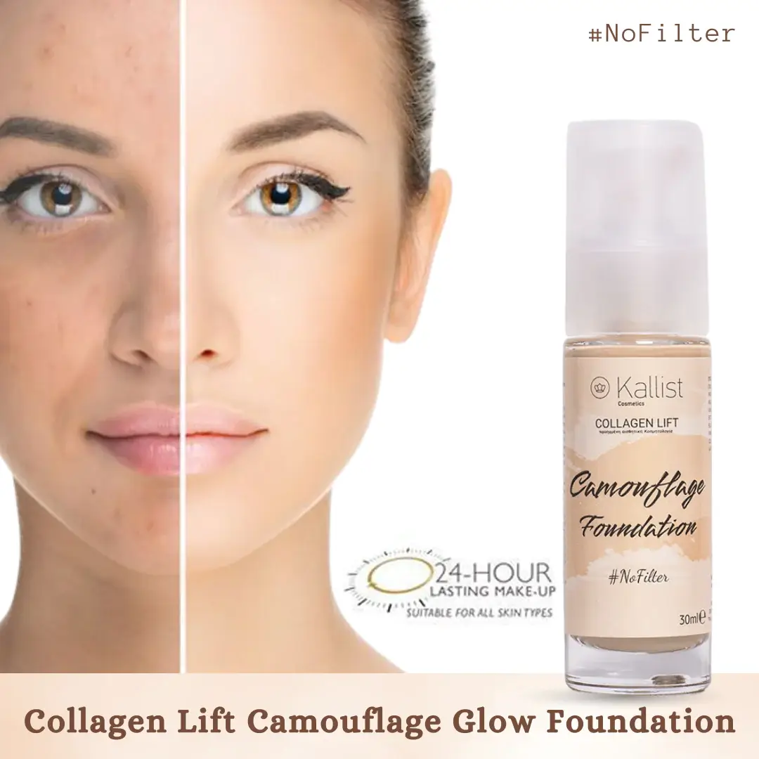 Το νέο επαναστατικό Collagen Lift Camouflage Glow Foundation είναι ενισχυμένο φυτικό Μake-up με ενσωματωμένη αντιρυτιδική ενυδατική φόρμουλα. Χαρίζει ένα λαμπερό και αψεγάδιαστο αποτέλεσμα και καλύπτει ρυτίδες και ατέλειες! Παρέχει ένα ελαφρύ ματ αποτέλεσμα και είναι ιδανική βάση για όλες τις επιδερμίδες.